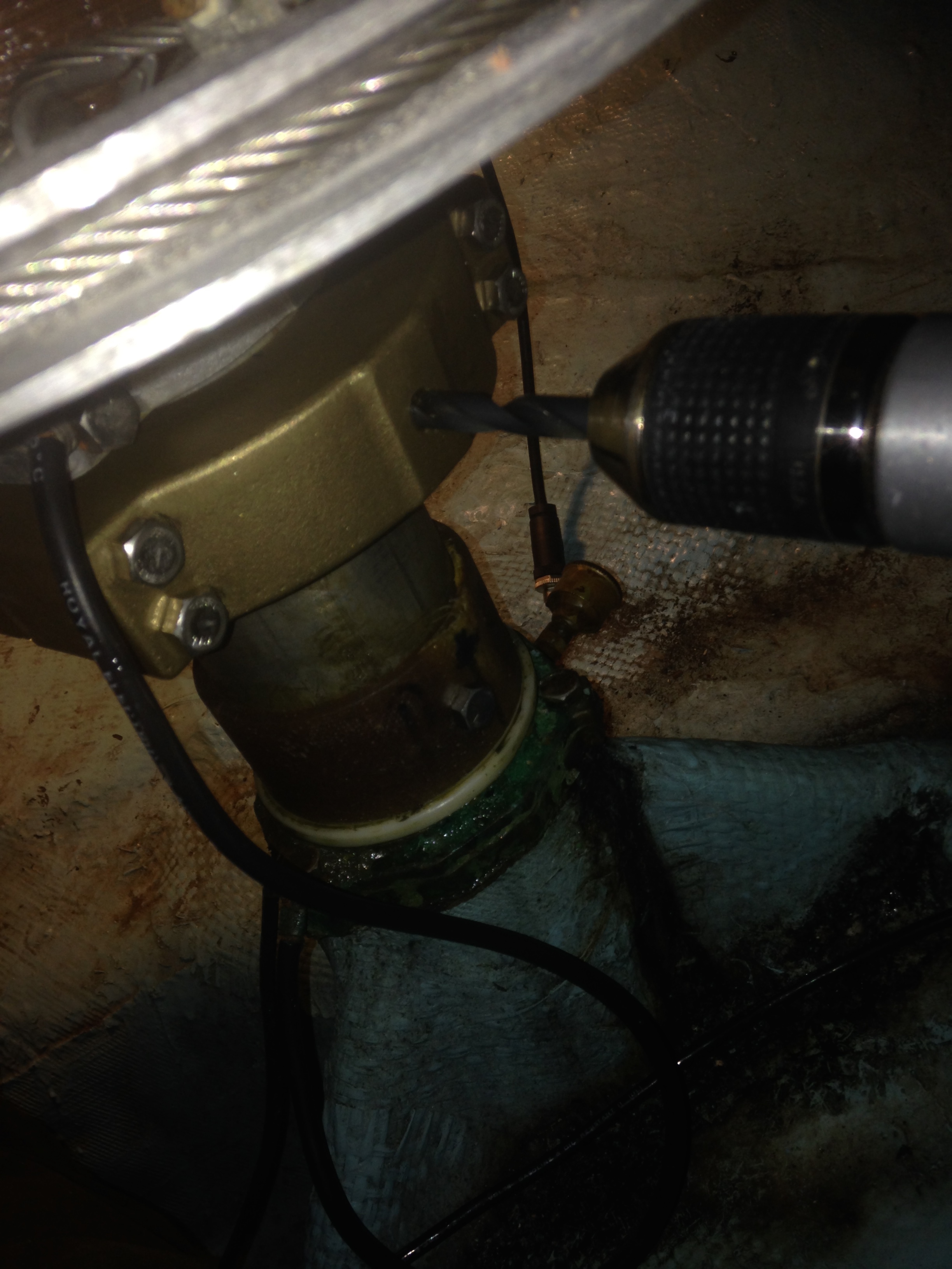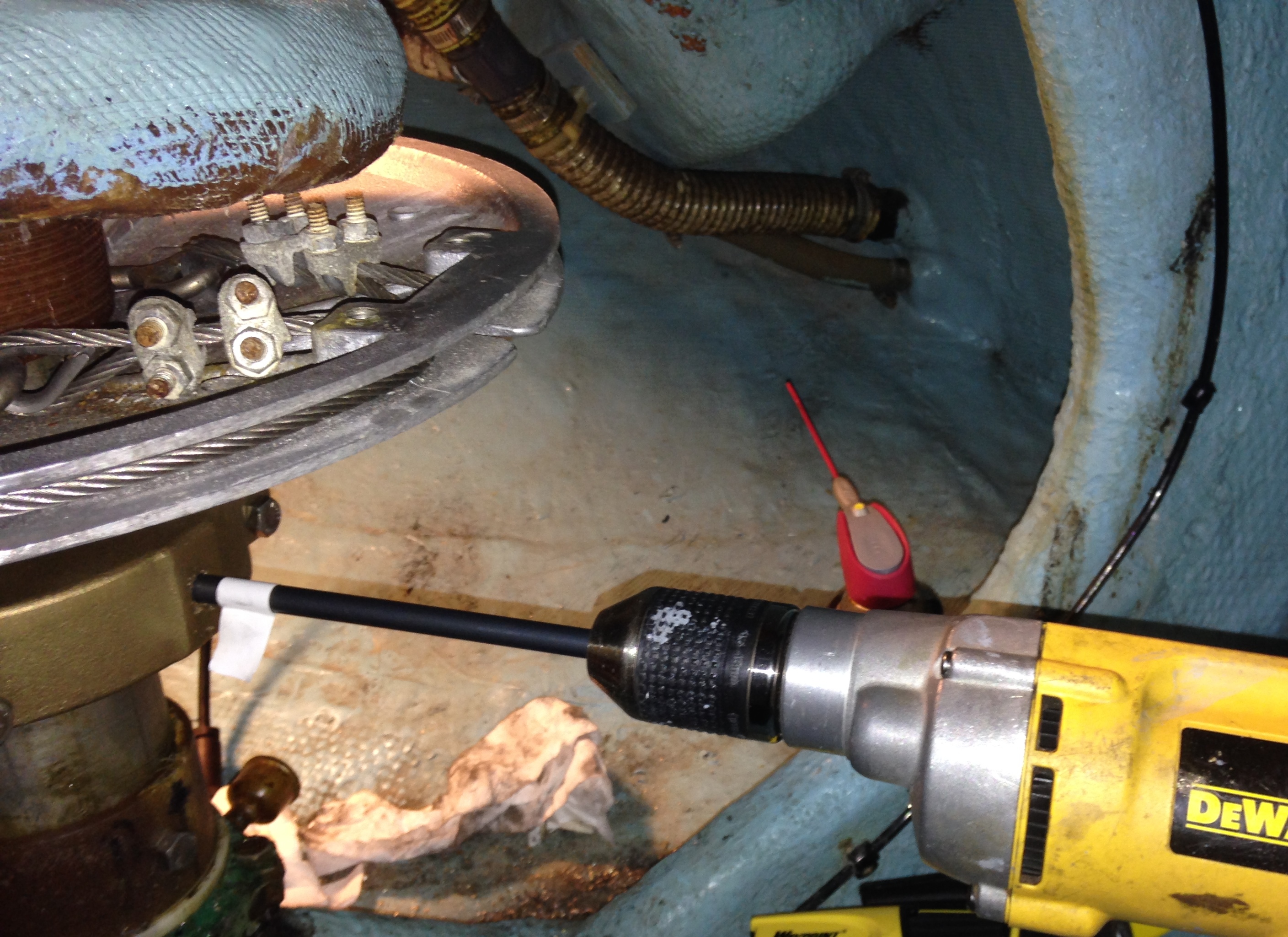 After I drilled through the outside in I chucked a 10″ 3/8 bit (Black Oxide) and started going at it. I used tape on the bit to gauge my progress. With lots of pressure I got through it in about 20 minutes. I pulled the bit every few minutes to clean the shavings. I could tell when I crossed from the stainless steel shaft to the bronze arm as the drilling got smoother and quieter. Never had any issues with overheating.