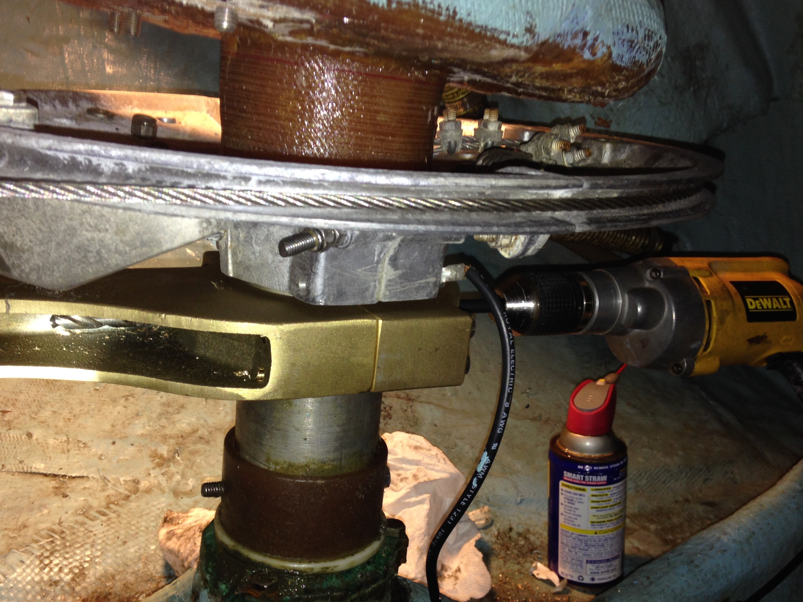 After getting the tiller arm attached I started working on rudder stop modification.  The rudder travel cannot exceed the drive travel or else the drive can be destroyed.  I hooked up the drive to the tiller and and moved it by hand to see where the drive stops are.  I then measured the distance to the rudder stops using drill bits as feeler gauges.  I then added 1/4″ as shock protection.