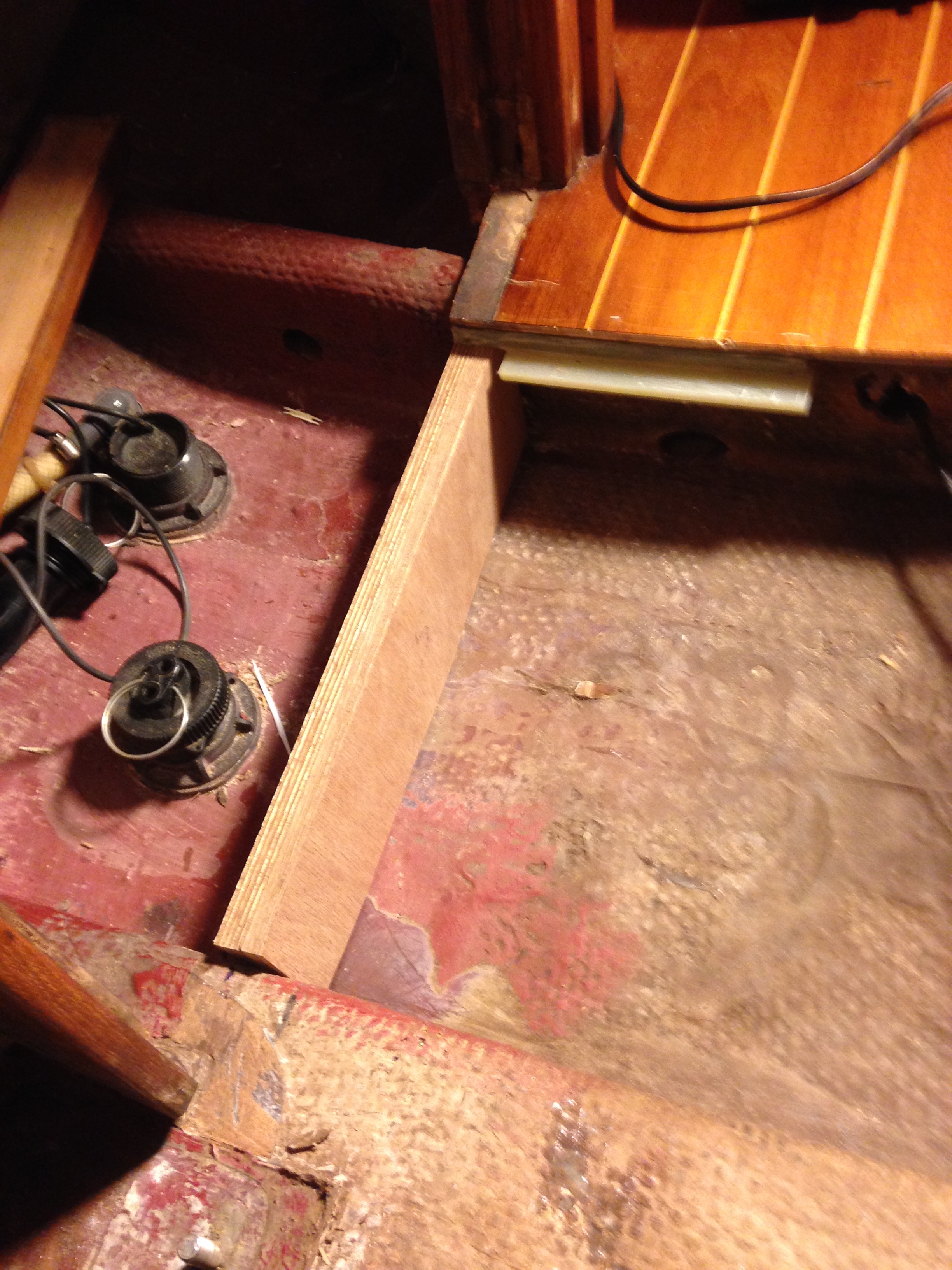 When I first looked at Calypso, the cabin sole looked pretty good with even color and very minor staining.  I lifted up the floor boards and felt that the underneath of the subfloor was dry, a good sign.  I did notice some water in the shower pan and that the shower support (a piece of plywood that supports the edge of the floor at the head and keeps the shower water in) was in rough shape.  When we had the boat surveyed, this was the #1 item to get repaired. When I looked closer I saw there was some water damage in the subfloor amidships of the head.  I decided to wait on the repair until I could get the boat out of the water and dry.