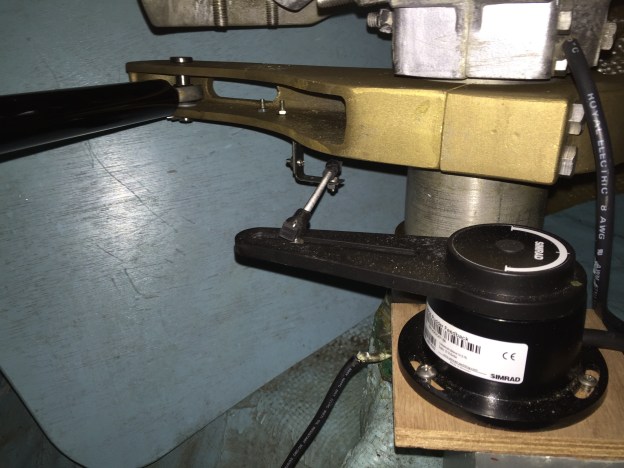 I attached the other end of the sensor to the tiller arm using the threaded rod attached to a small stainless L bracket, screwed (drilled tapped first) into the tiller arm.  I don’t have any good pictures of this.